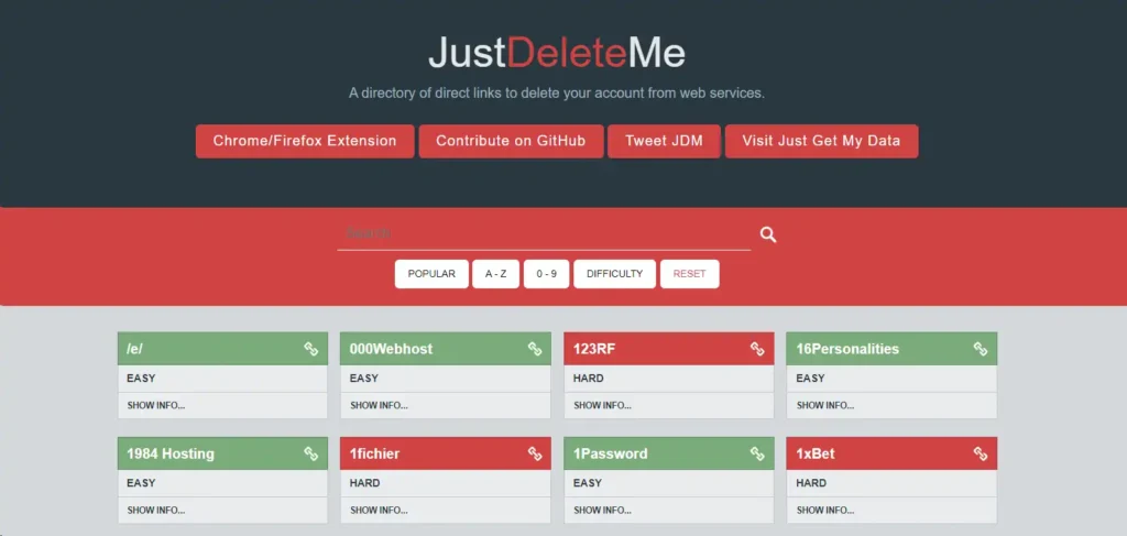 Just Delete Me addresses the challenge of account deletion across various platforms. It color-codes the difficulty of the process:
