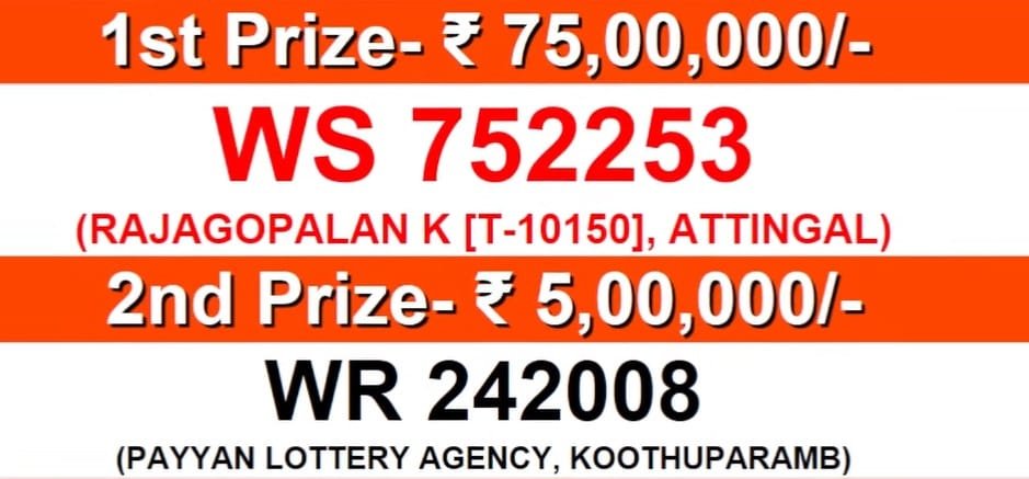 WINNING NUMBER FOR 1ST PRIZE WORTH RS 75 LAKH IS WS 752253 (ATTINGAL)